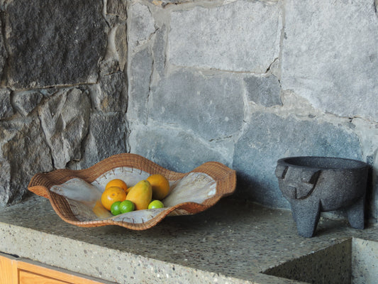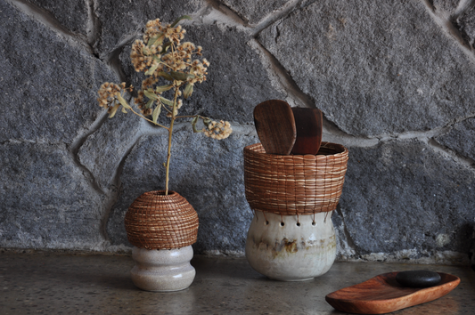 Esmaltadas con tonos que nos remiten a la tierra y a su pureza. Buscando tener una continuidad yabrazo por el tejido de Ocoxal. El Ocoxal proviene del náhuatl ocotl: y xalli: arena de ocote, hojas oagujas de los pinos Ocote.