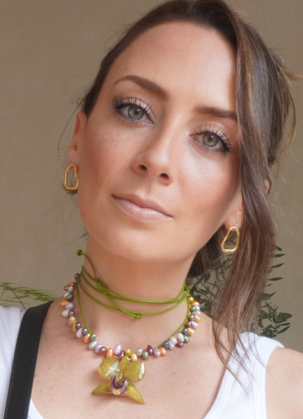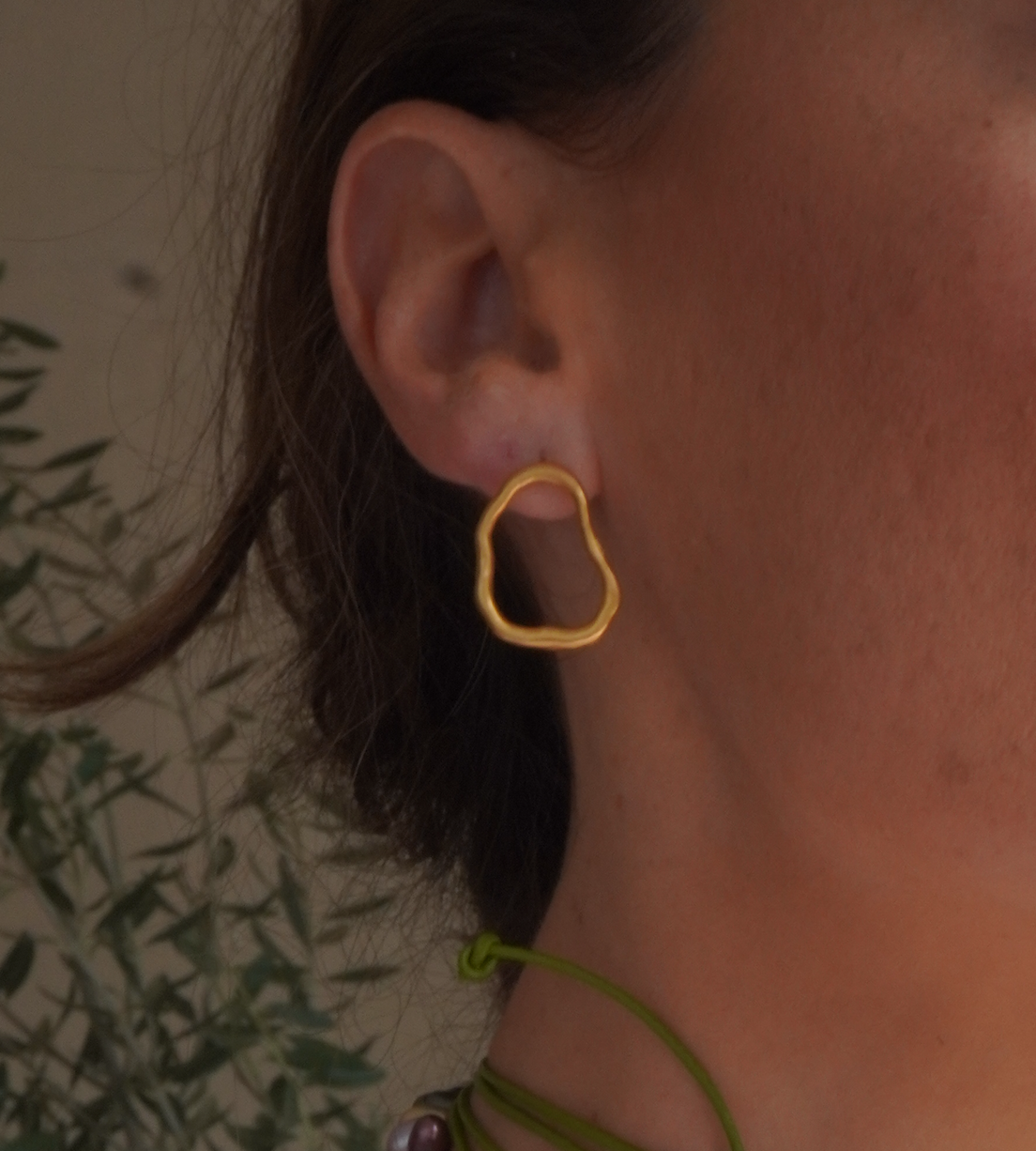 Pendientes amorfos hechos a mano. Cada diseño único se adapta a la forma del rostro y su color dorado da luz y realza sutilmente los reflejos.