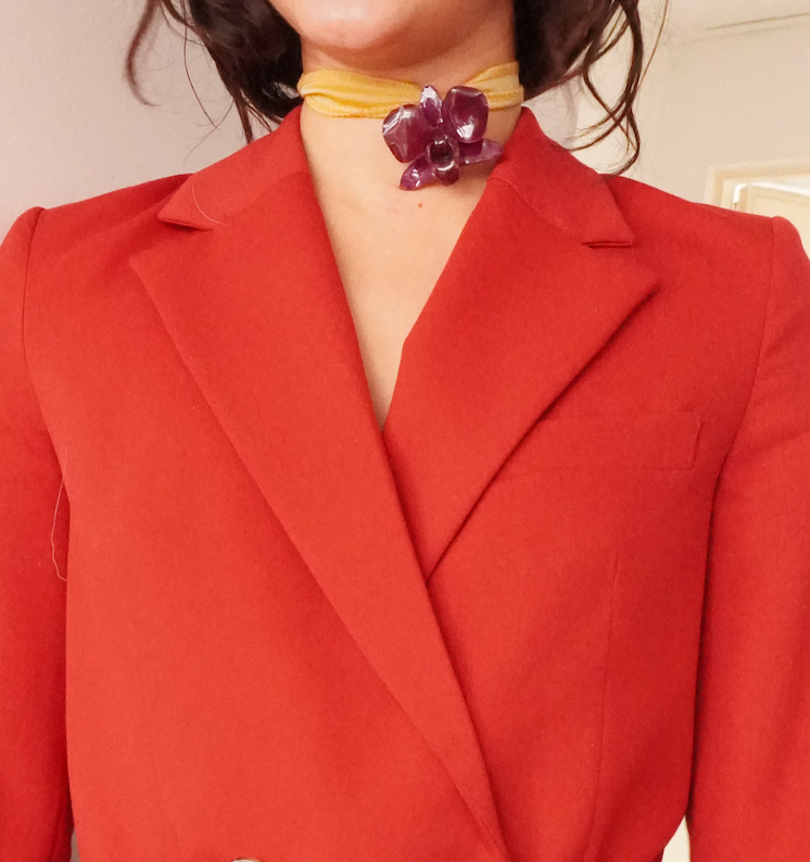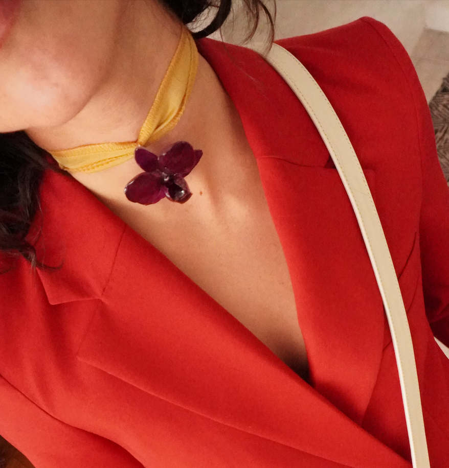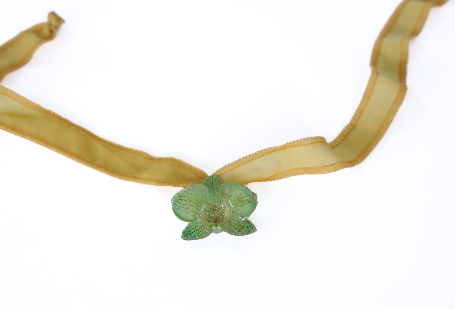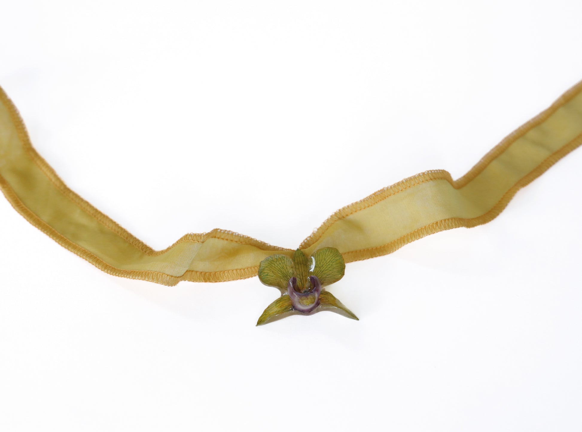Tamaños: Orquídea de 4-5 cm de diámetro. Correa de piel de  145 cm de largo. Correa de seda 80 cm.