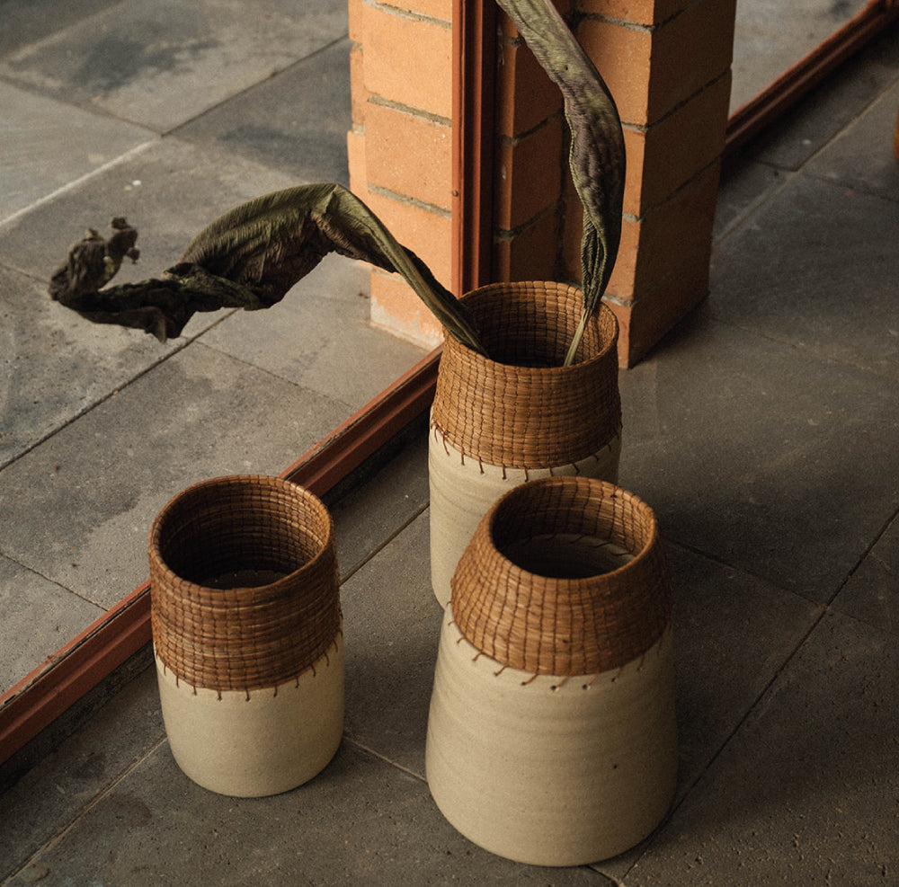 Jarrón tejido a mano con hoja de pino por mujeres artesanas de la comunidad de Santo Domingo Ocotitlán , Morelos. Con el objetivo de incentivar el cuidado de los bosques de la zona, generando un ingreso económico para su comunidad.