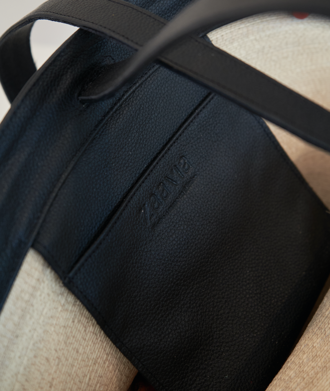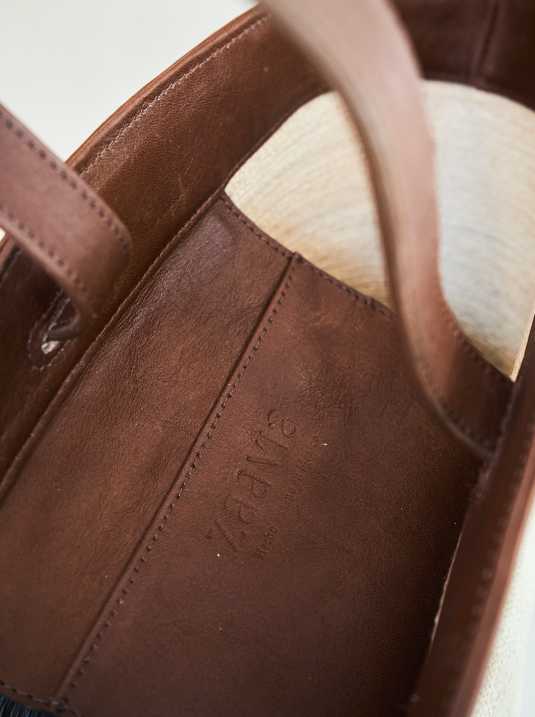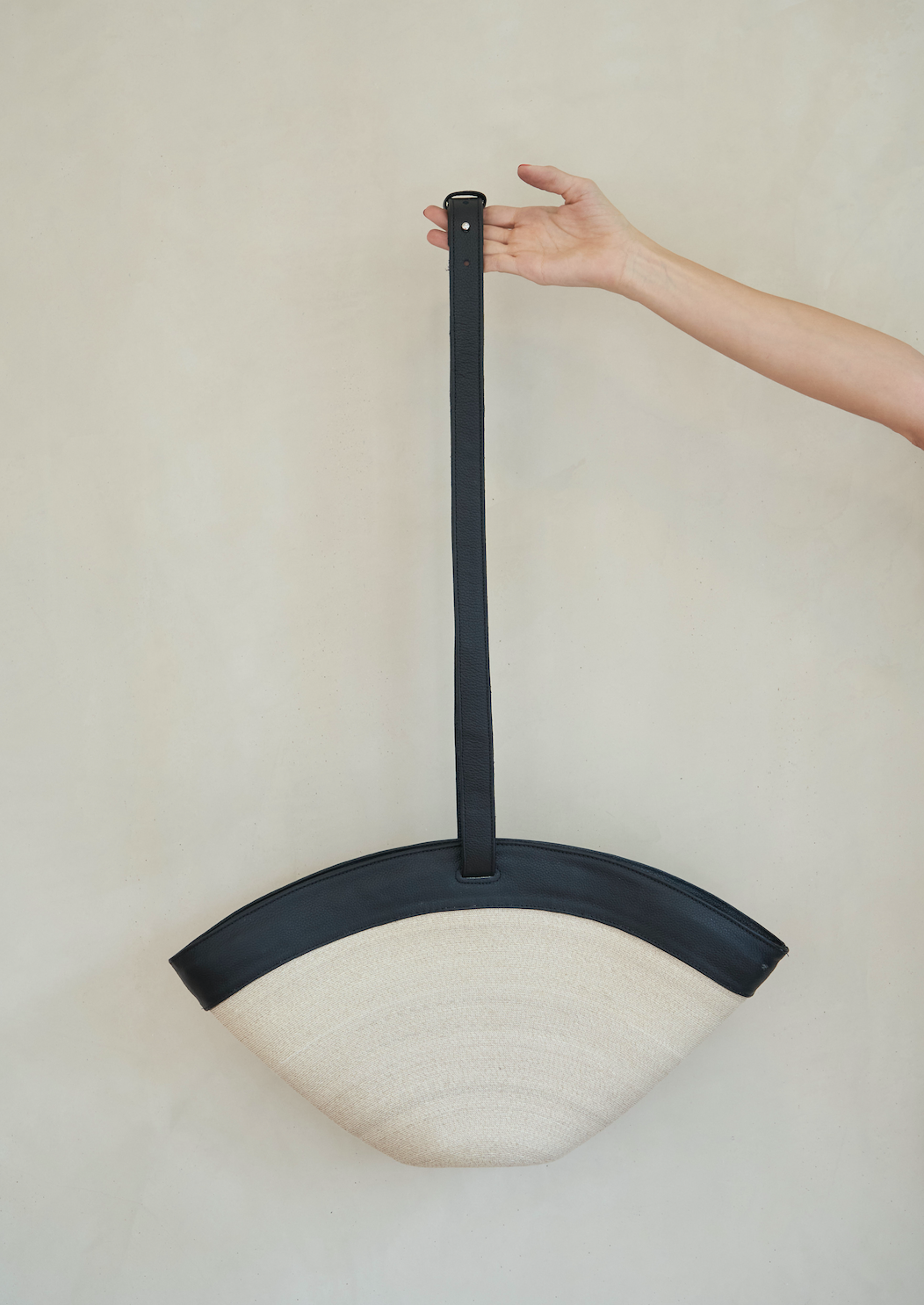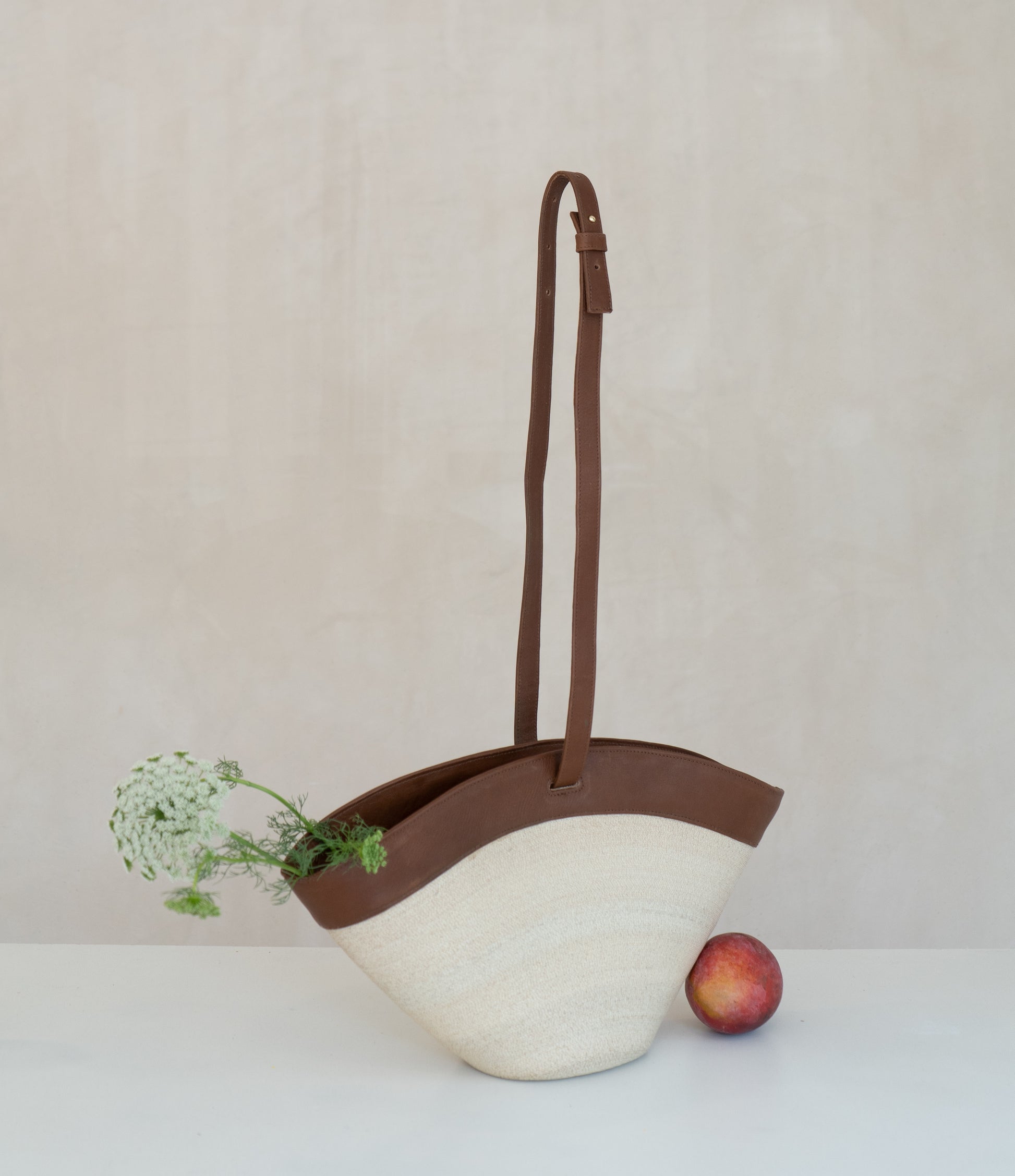 Palma natural. Complemento en ruedo de piel. Asa con función de cierre, largo ajustable con piolín. Alto de 20 cm x ancho de 50 cm.