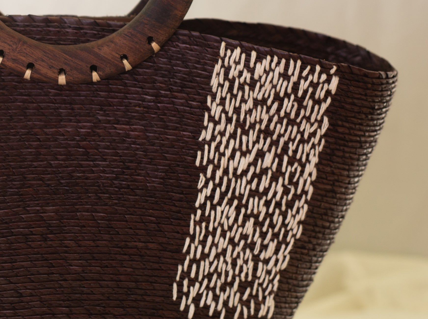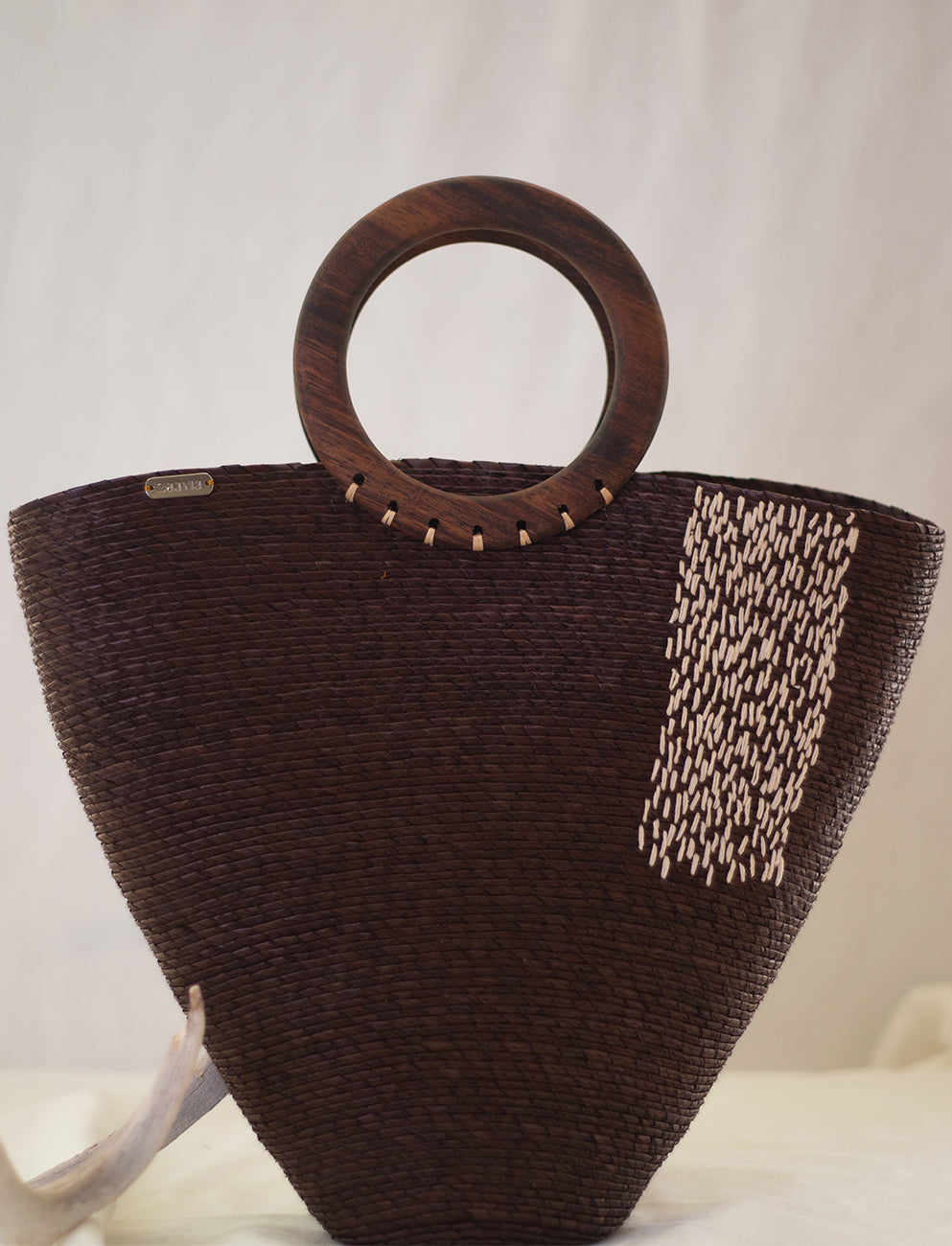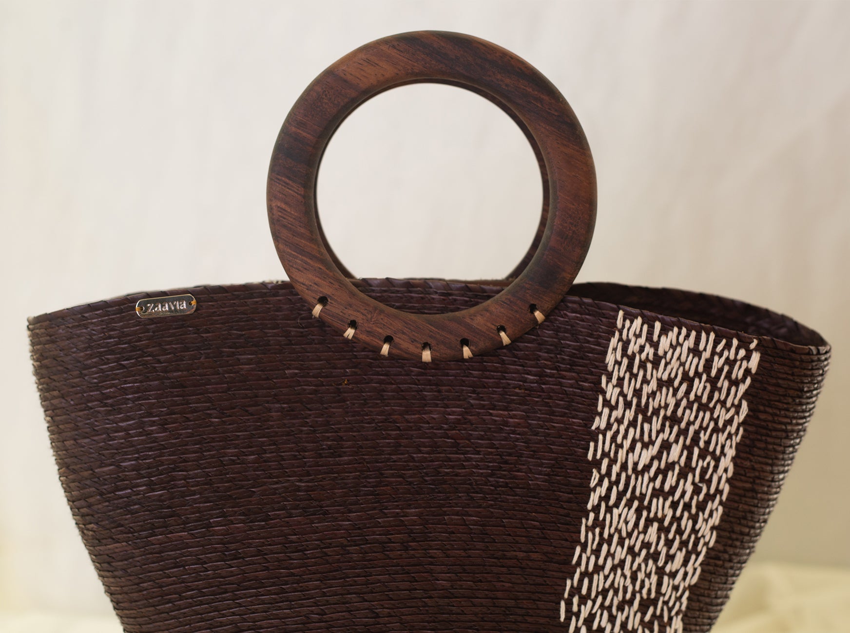 Wine palm bag . 30 cm high x 35 cm wide. 15 cm recycled wood handles sewn with palm thread.