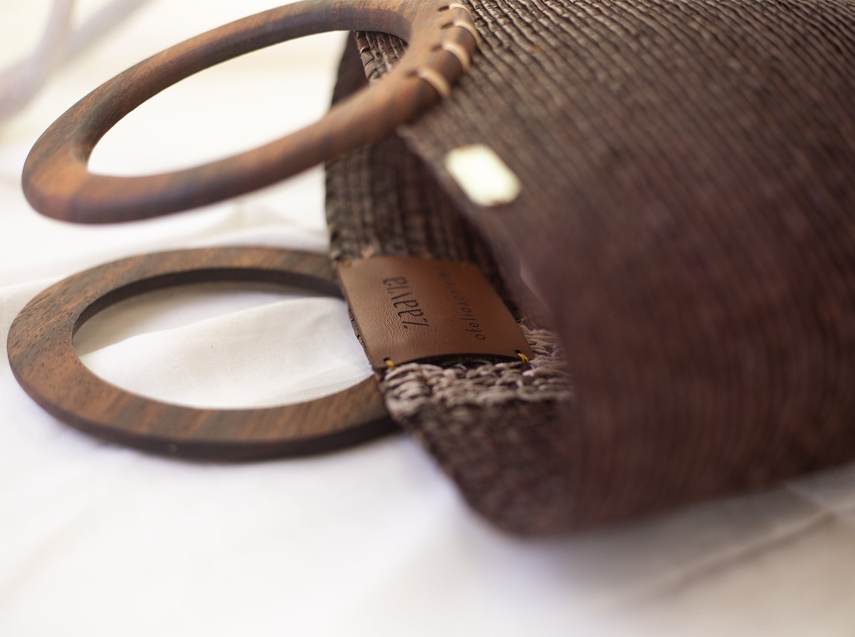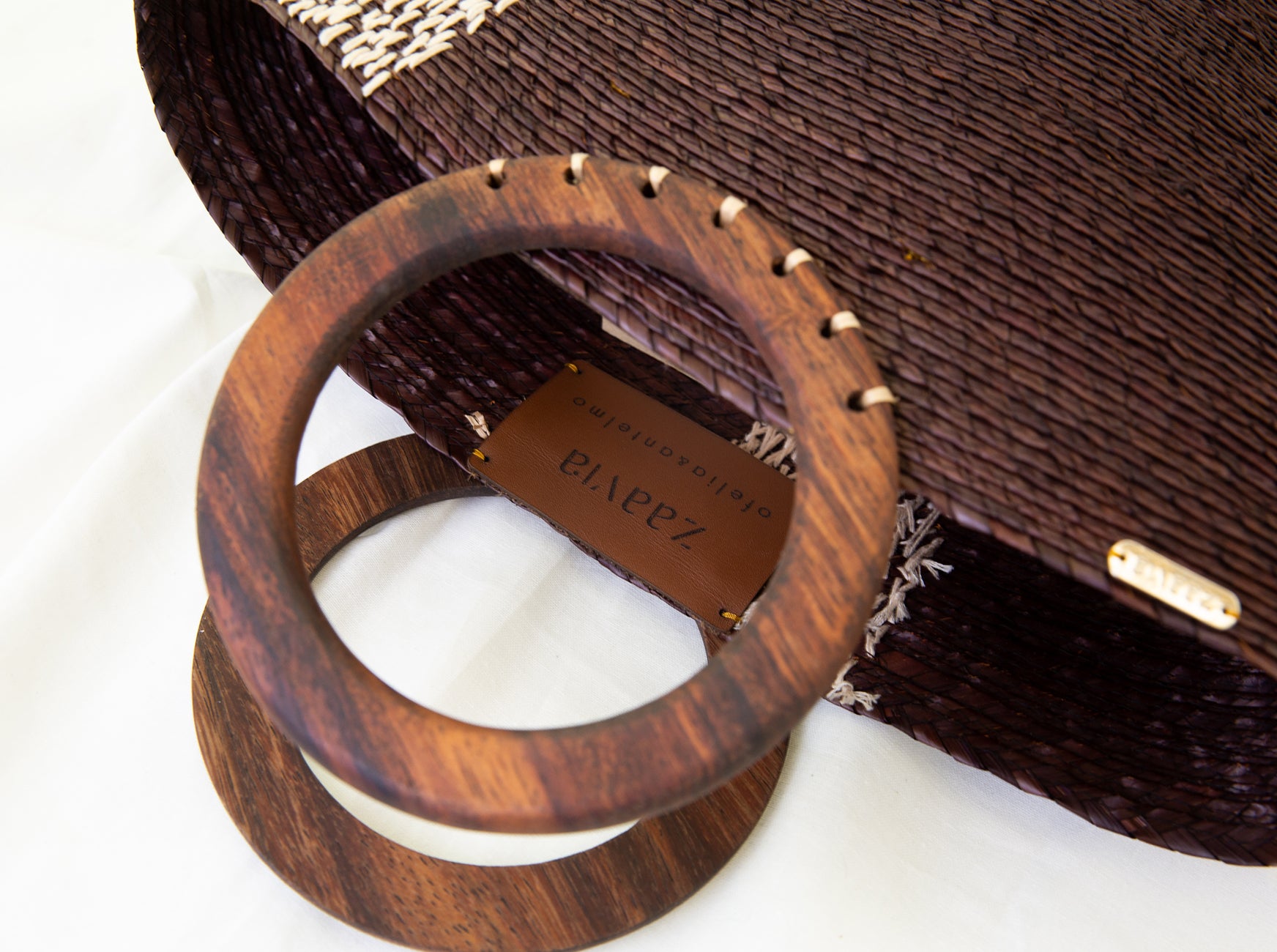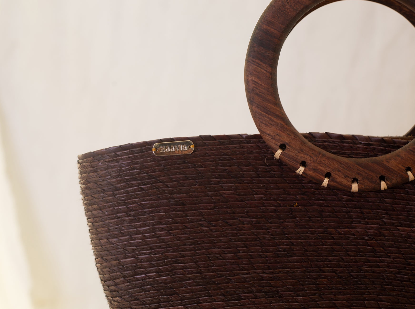 Wine palm bag . 30 cm high x 35 cm wide. 15 cm recycled wood handles sewn with palm thread.